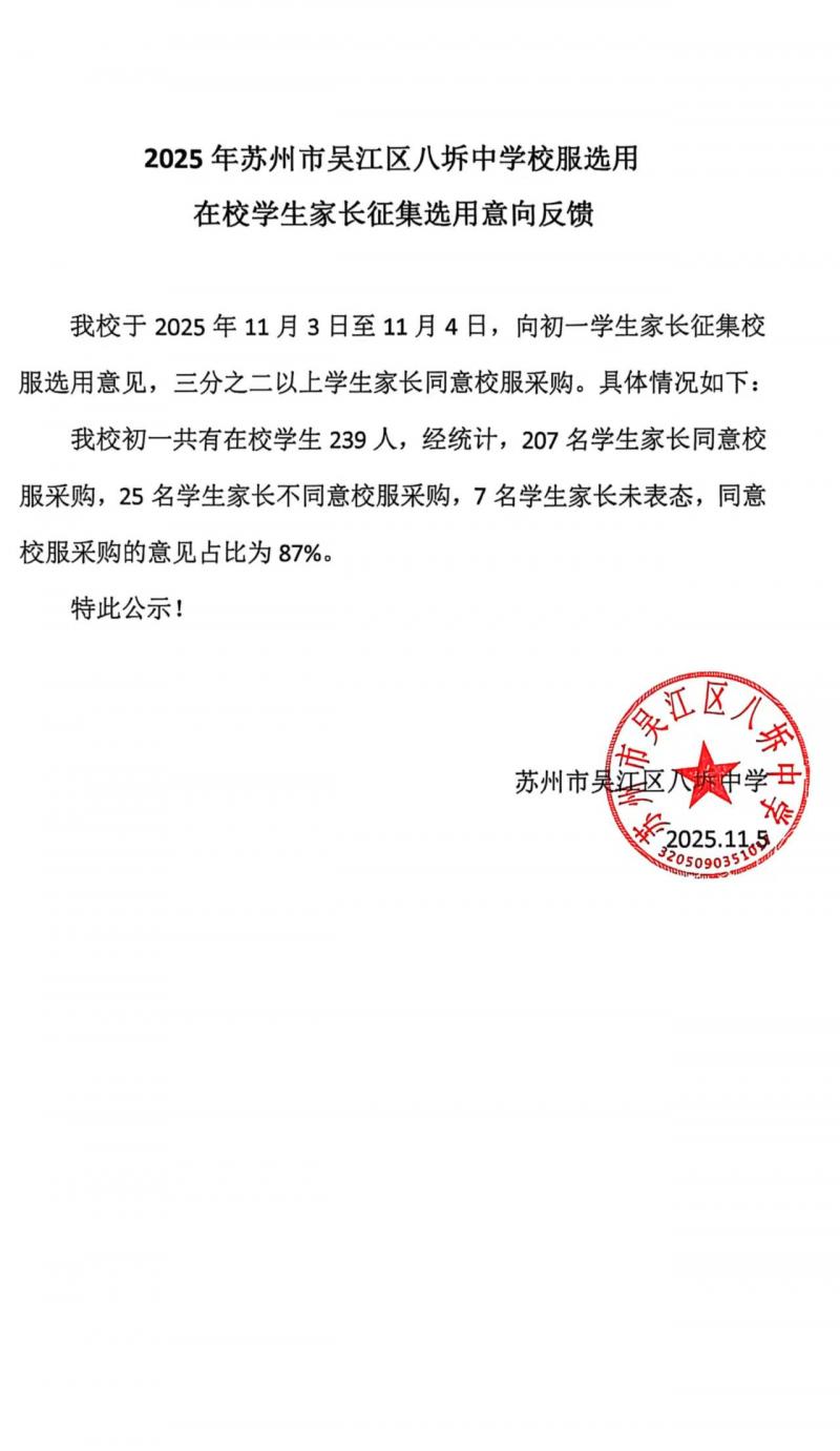 2025年苏州市吴江区八坼中学校服选用在校学生家长征集选用意向反