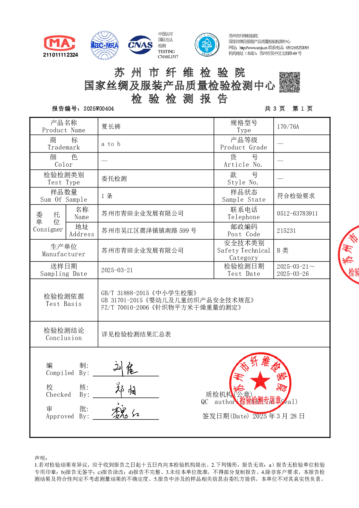 2025学年校服双送检结果公示
