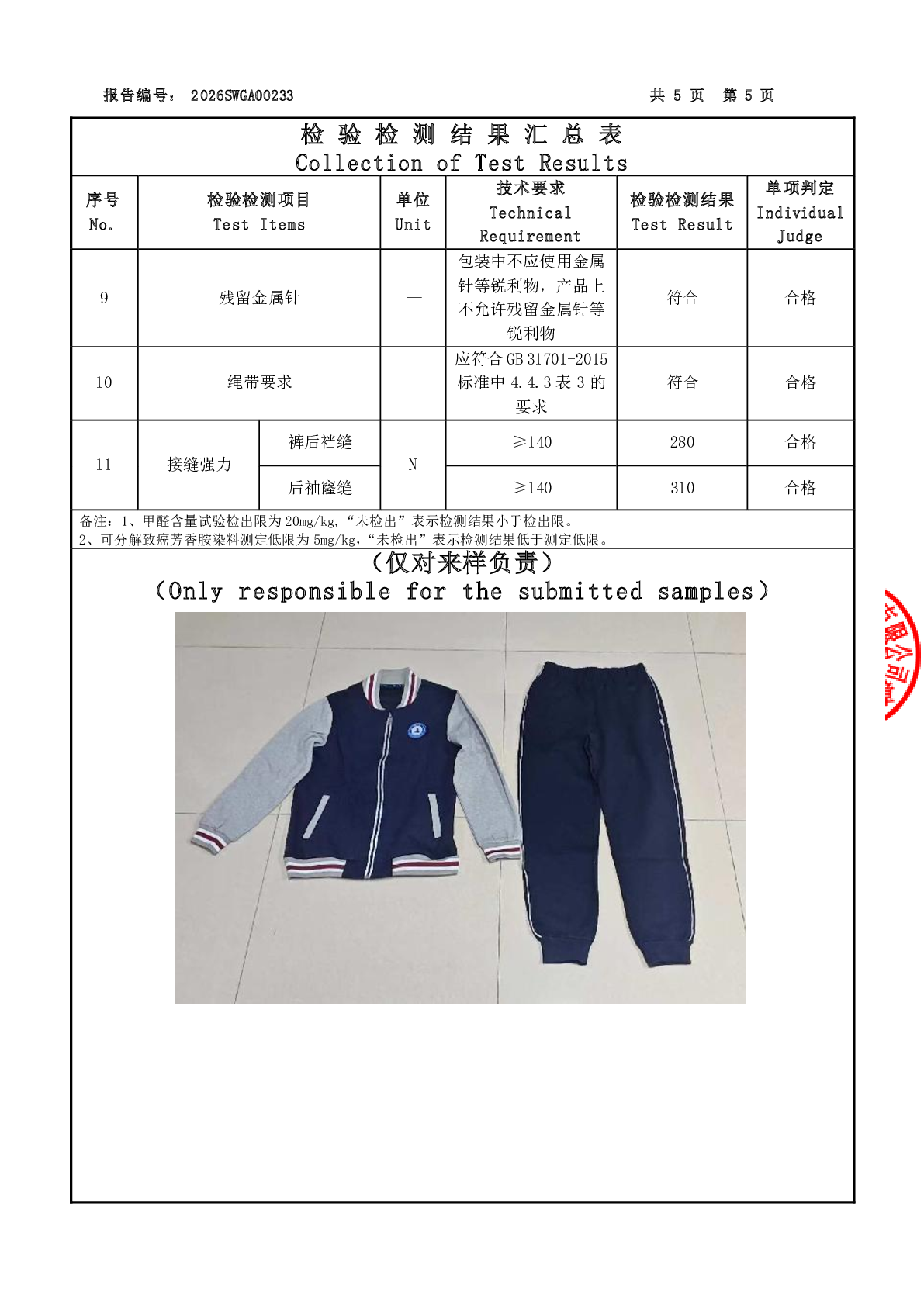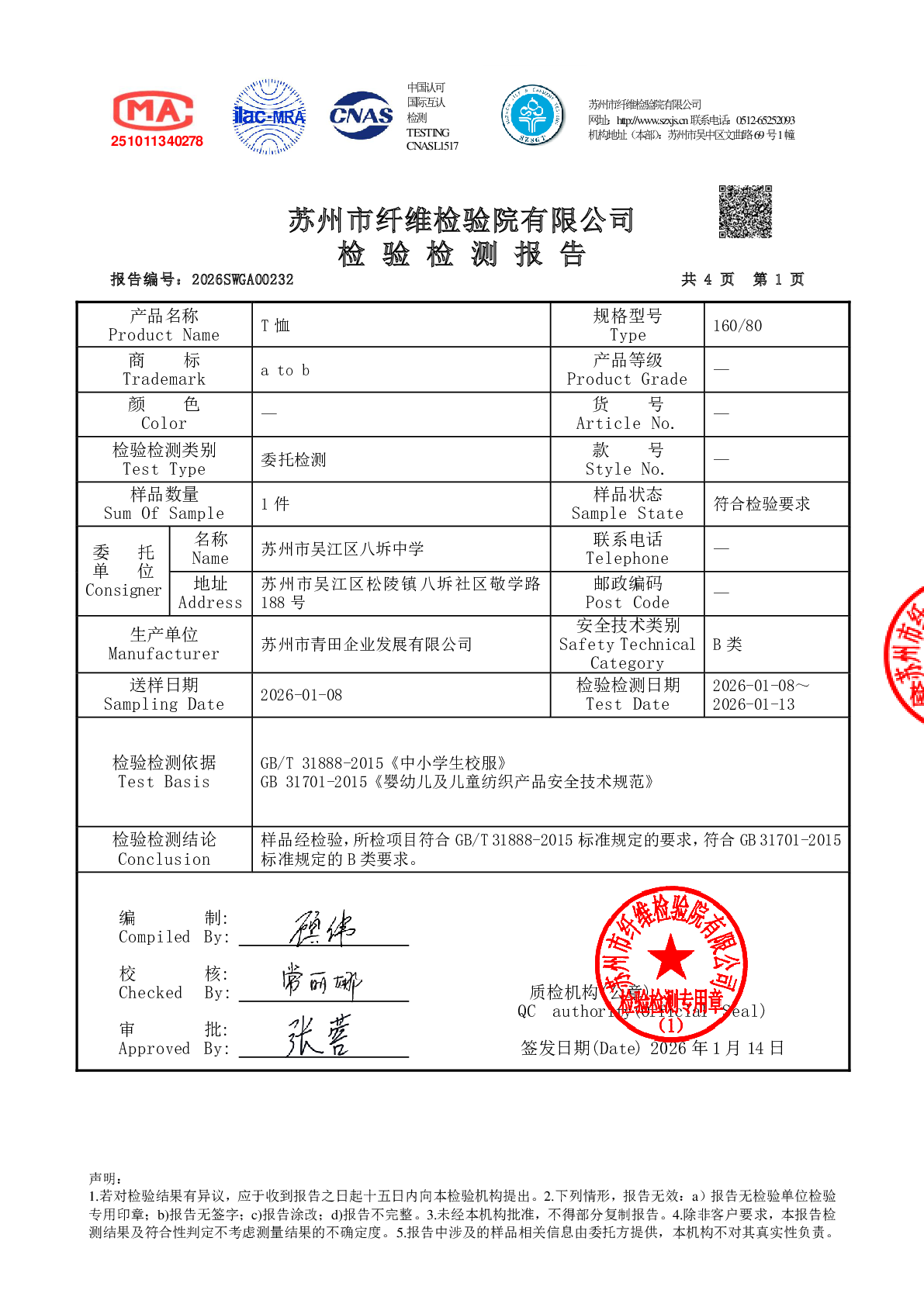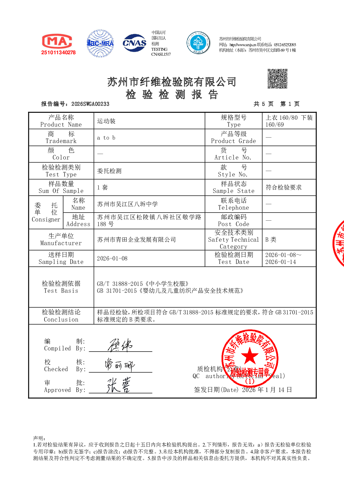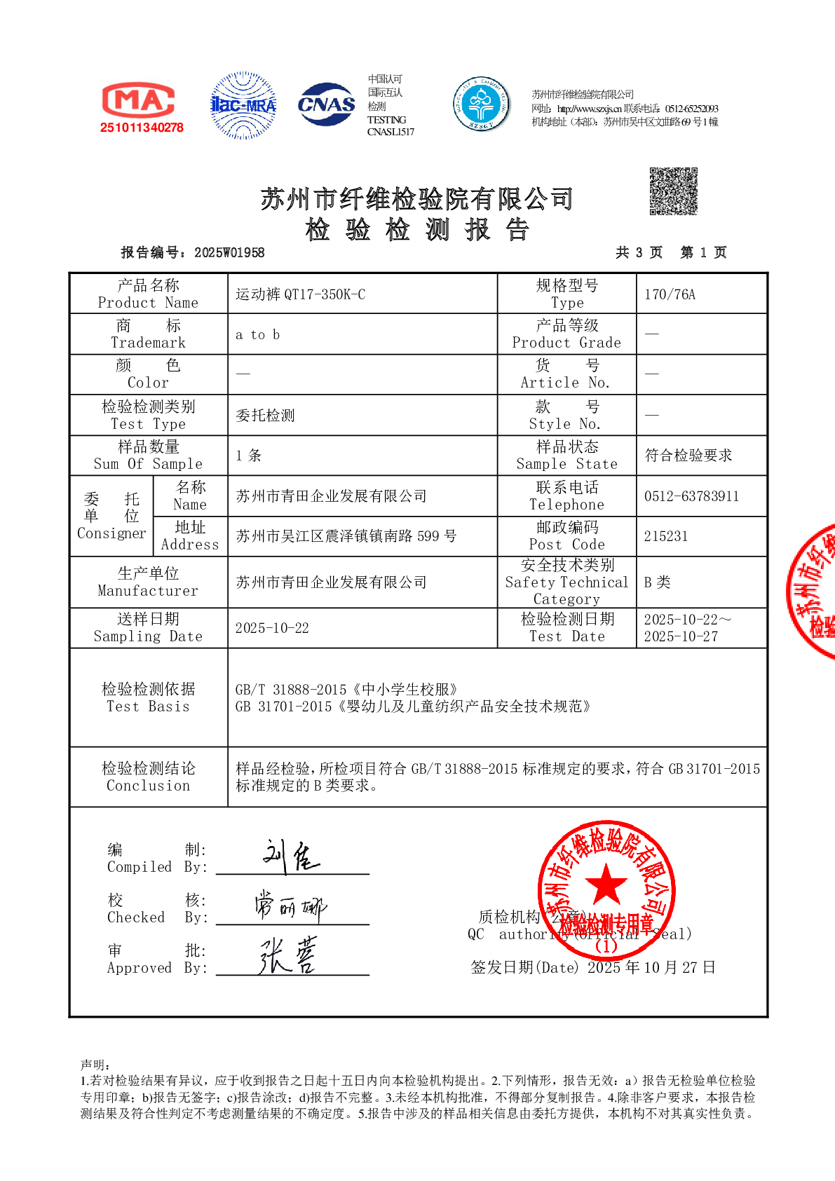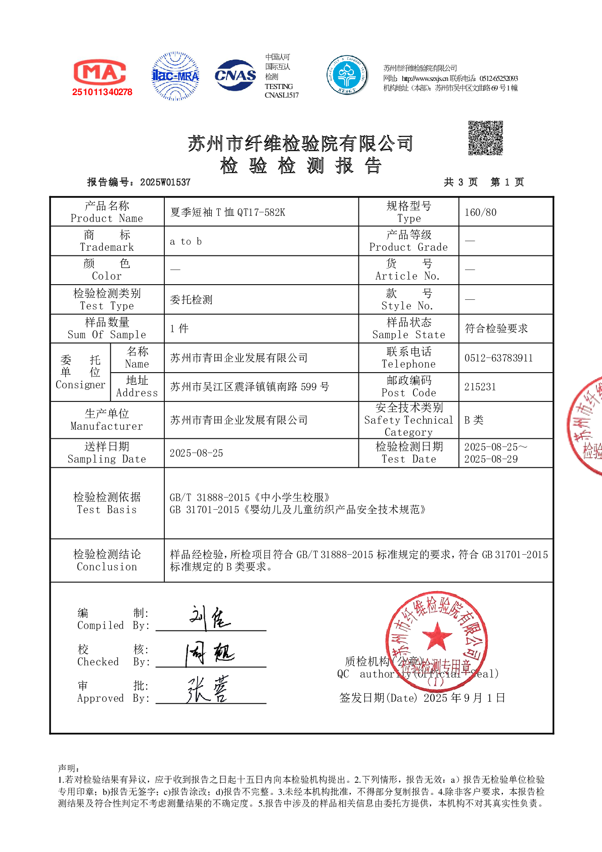 2025学年校服双送检结果公示
